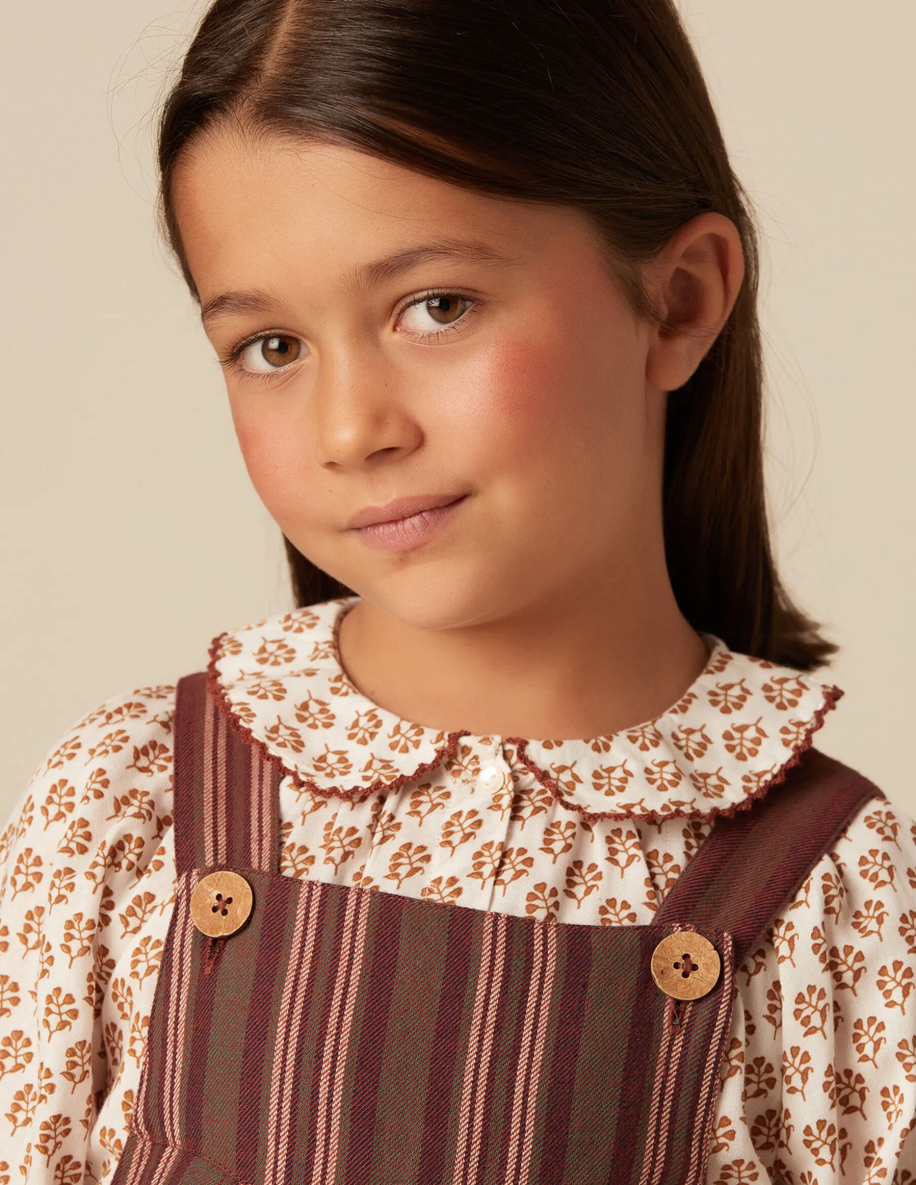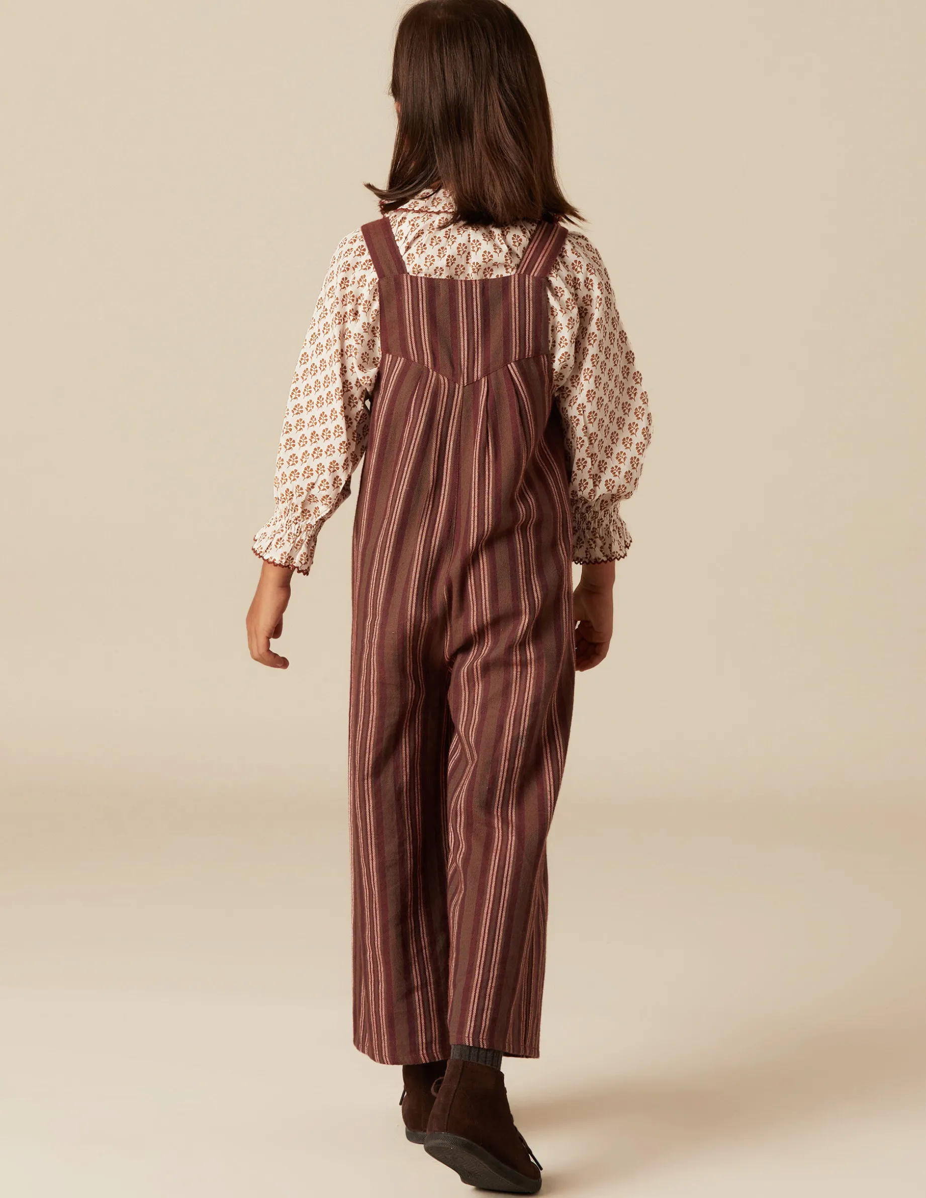 Peto de niña, en tejido de algodón de rayas. Patrón largo, con tirantes que se abrochan con un botón de madera.