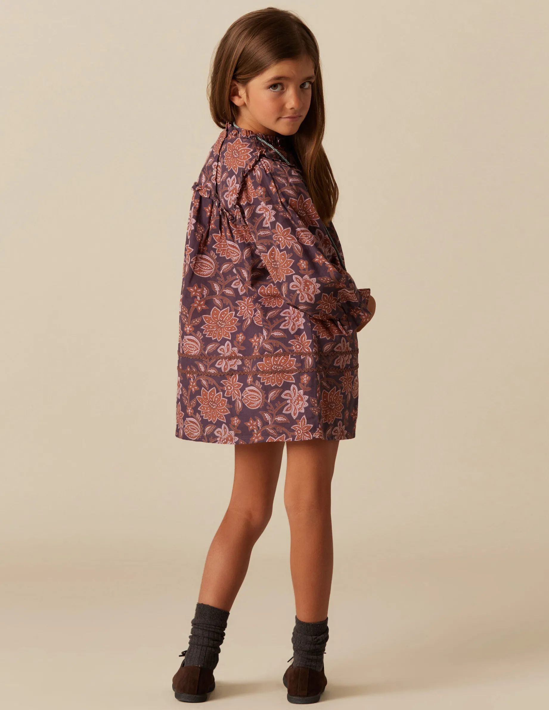 Vestido corto de niña en print de la colección. Patrón con cuello perkins, manga larga y detalle de jaretas en la zona del pecho. Se abrocha por la espalda con botones.