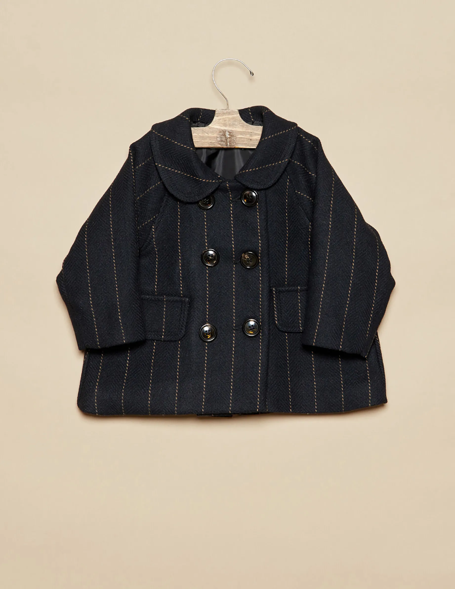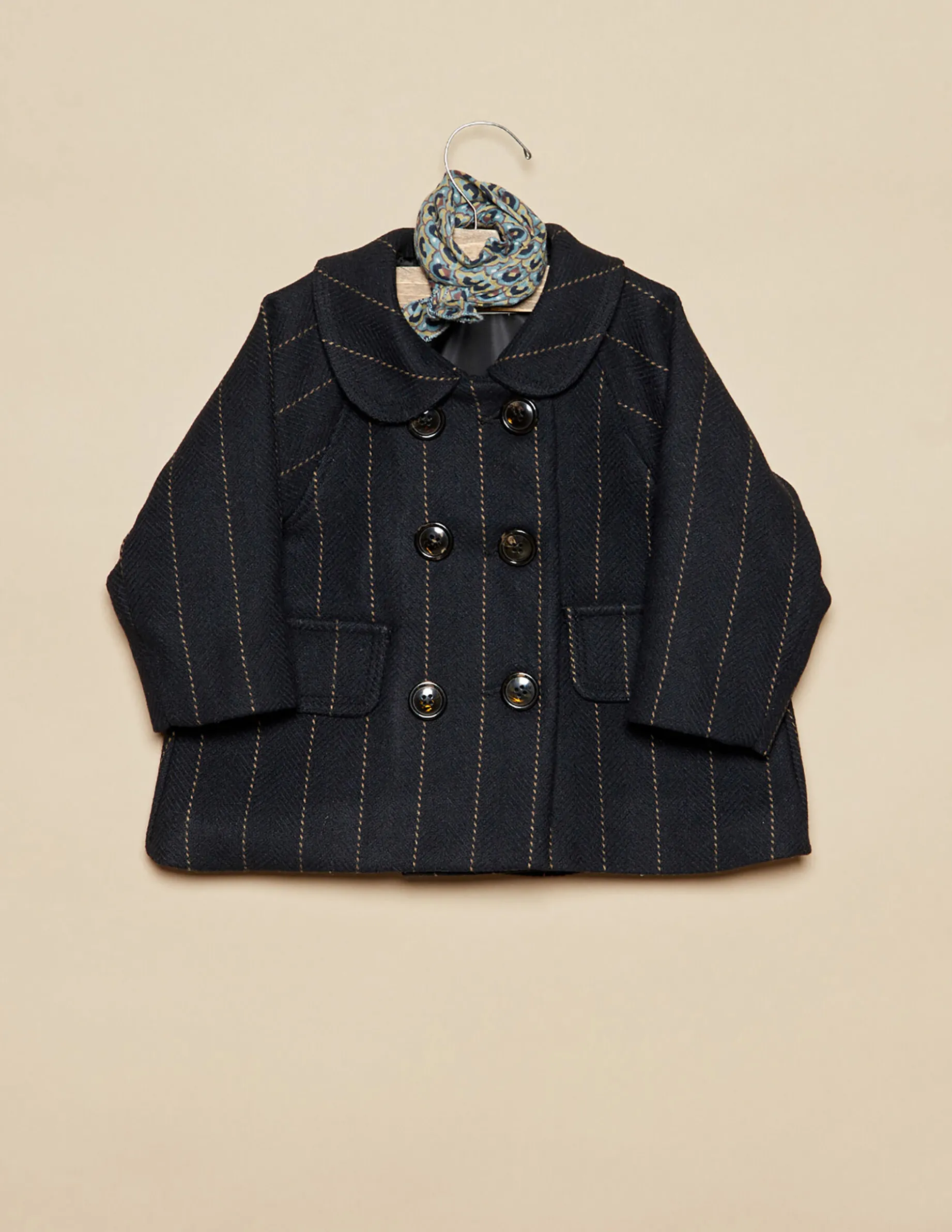 Abrigo de bebé de vestir, en tejido de lana azul marino con rayas. Patrón clásico.