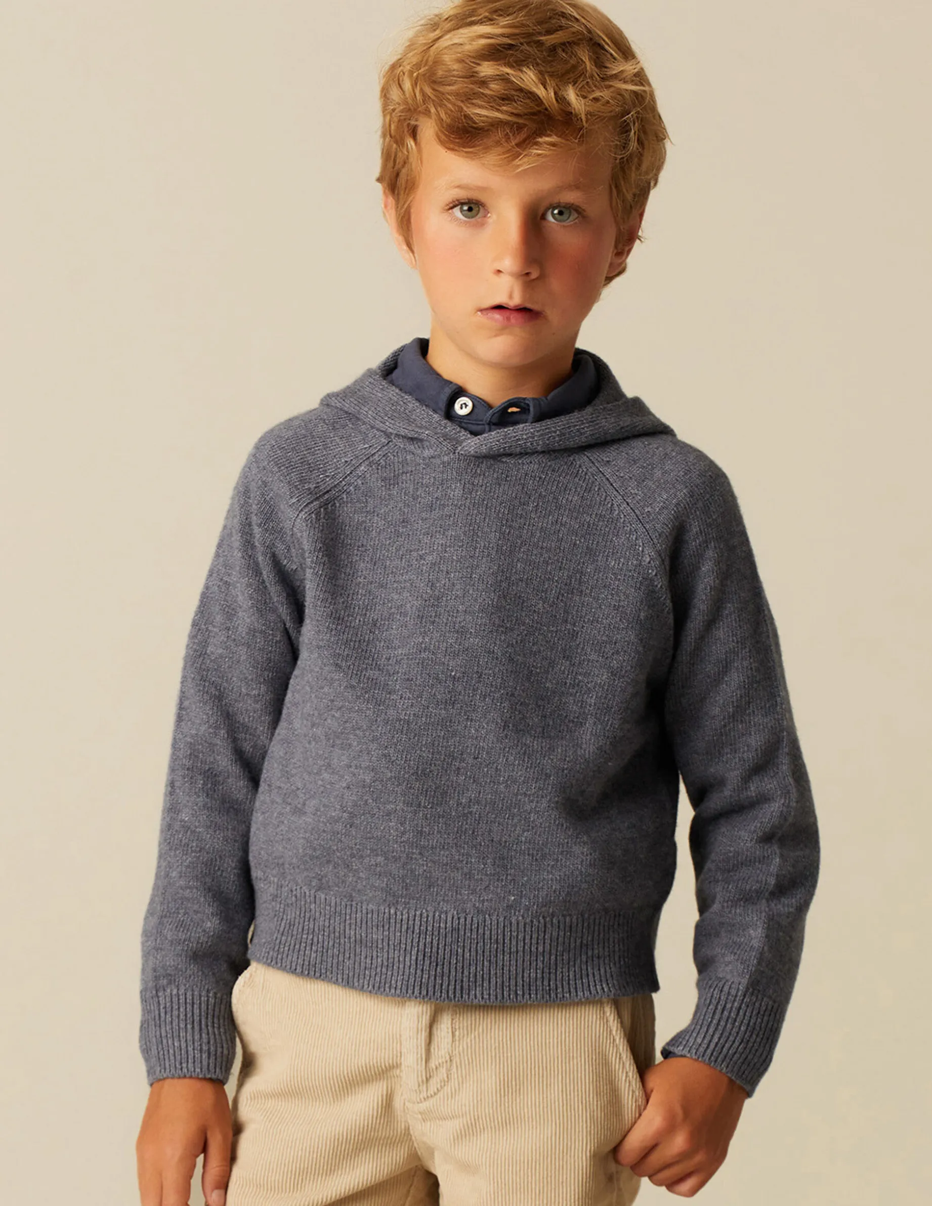 Jersey azul jaspeado con cuello cerrado. Detalle capucha.