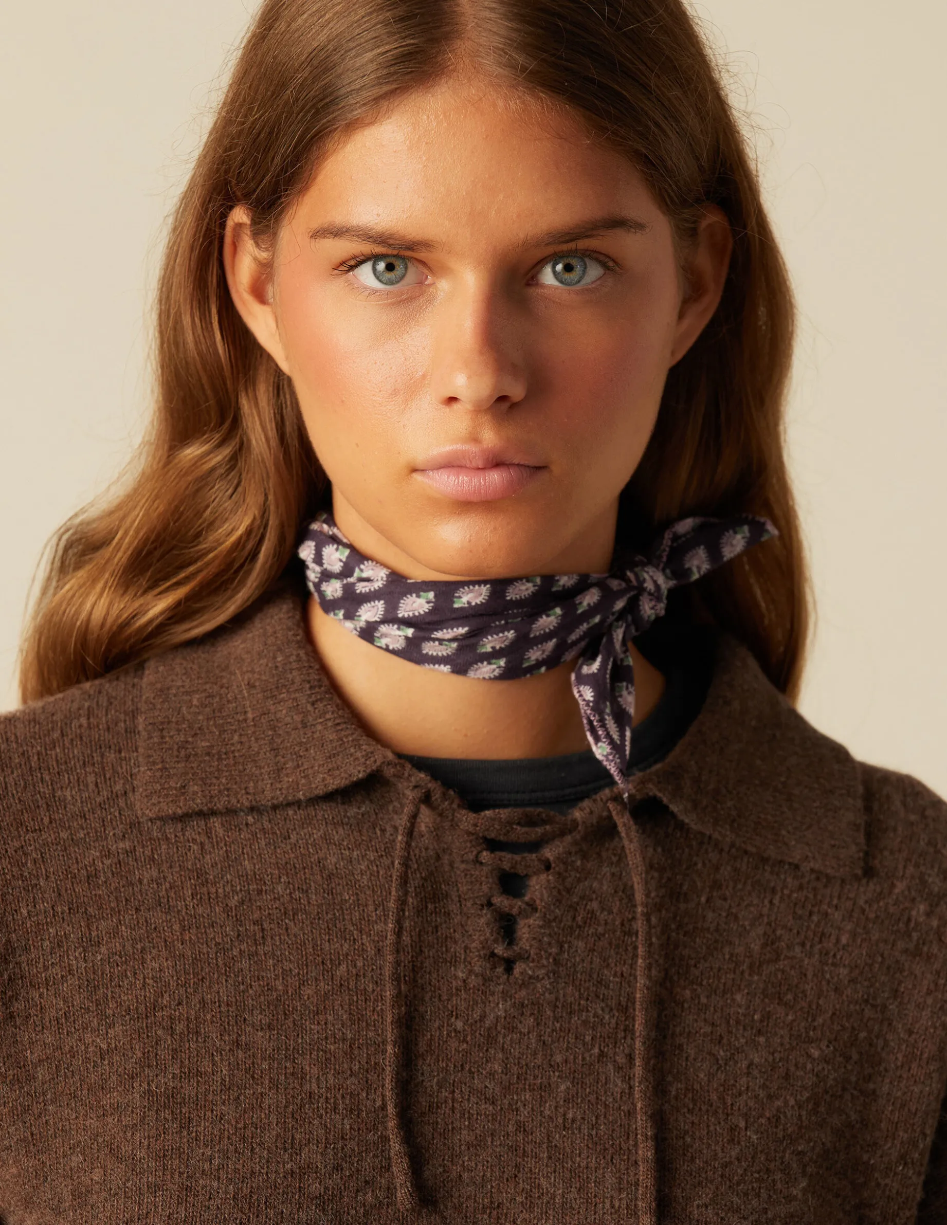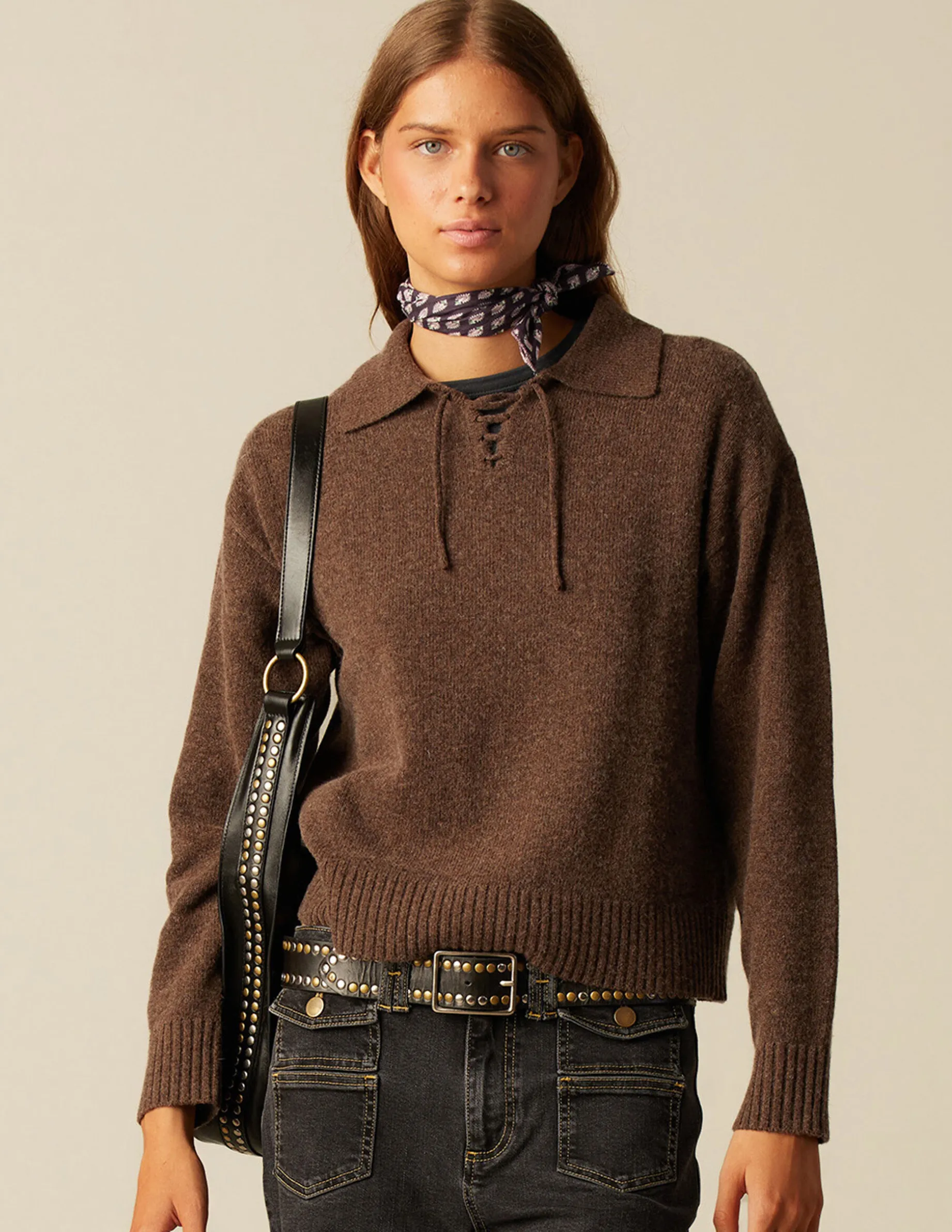 Jersey marrón jaspeado y cuello solapa con detalle de lazo.